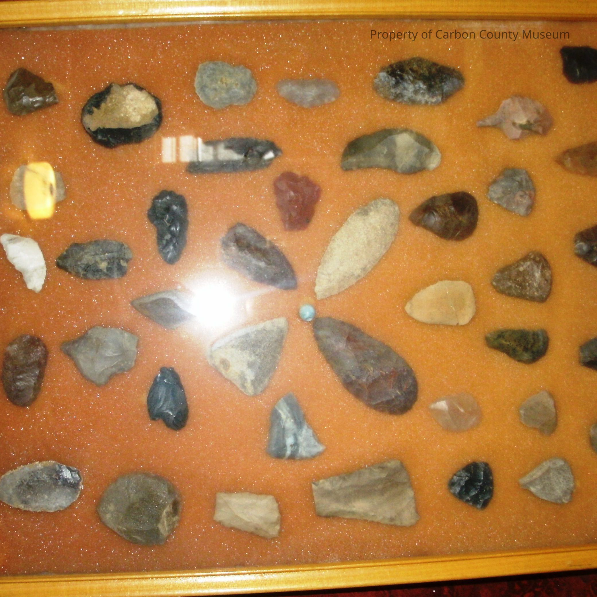 A 11 3/4" x 14 5/8" frame with glass front of 40 pieces of various arrows, tools, chips,--almost all are small with few medium sized. There is a single blue bead at center of flower design at the center of the frame. A gold narrow wood molding frame with artifacts mounted on an orange/tan foam backing. Good condition with few scratches on frame. Written on back in red: found in Sweetwater Co., WY and Moffat Co, CO. between 1955 and 1988 by Mary Haughey, Craig, CO. Good condition. Few scratches on frame.Collection