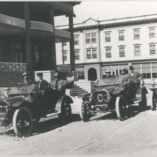 Black & white print. Snapshot. Mounted on light brown matboard with raised frame around image. Image of three vintage automobiles parked in a staggered line on a dirt street in front of a large stone building. The tops are down on the automobiles & the windshields are folded & angled. A large "C" is attached to the radiator grill of each auto. Three men sit in each vehicle. All the vehicles have right hand (English) drive.