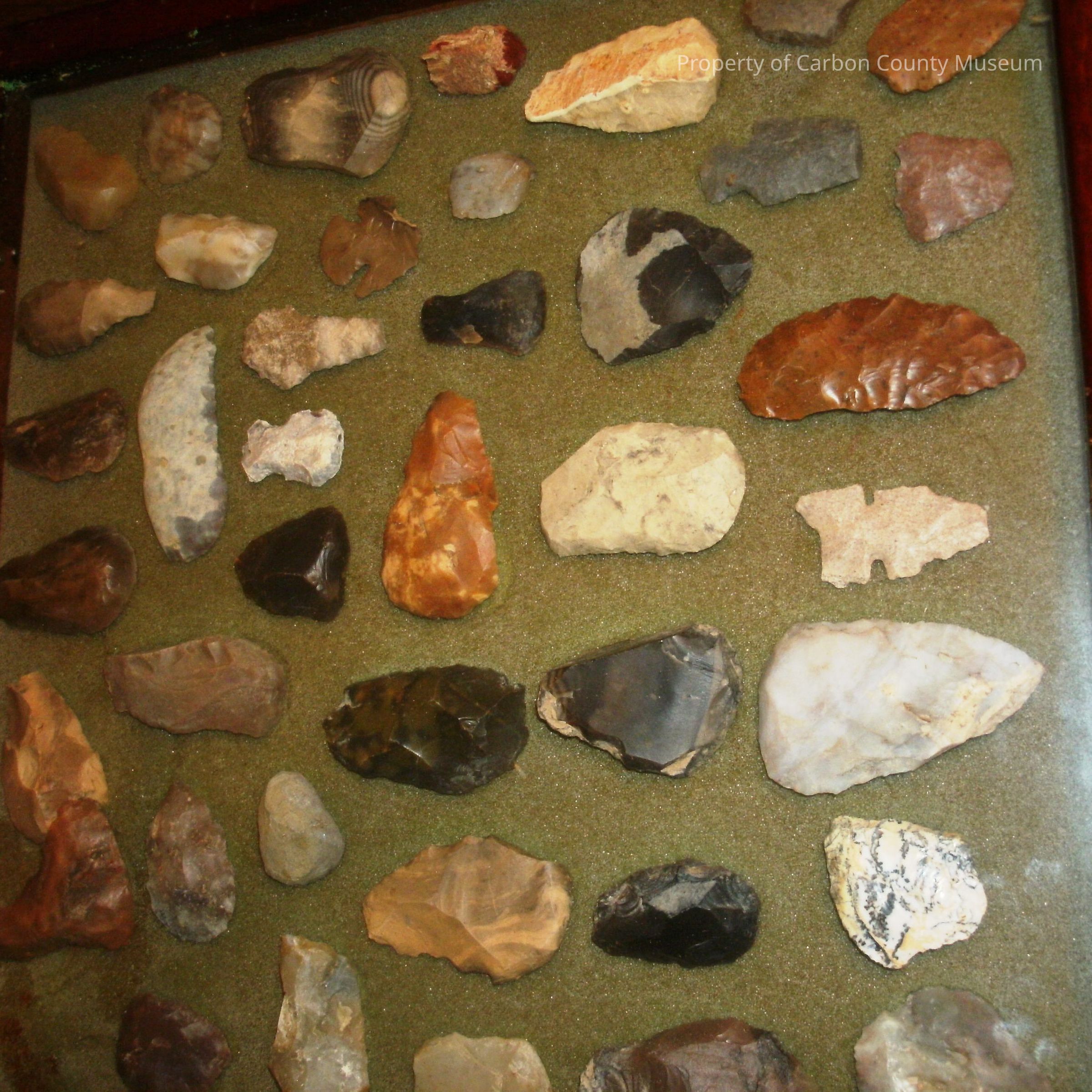 A 12 7/8" x 13" reddish brown wood frame with green foam background material. There are 41 pieces of scrapers, points and worked stone in 7 informal rows. One stone is loose at top left. Good condition, but frame is scratched. Written on back: Found by George Gates, Craig, CO 1961-1978 in Red Desert, WY and Moffat Co., CO.Collection