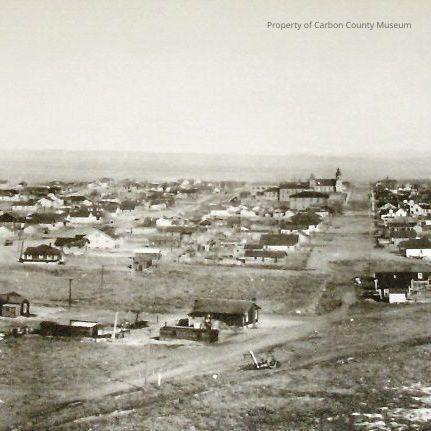 Update - 2009. Black & white print on grey backing. Image of birds eye view of Rawlins. Old Wyoming State Penitentiary has the water tower & walls built around facility. Catholic Church & Central School are visible. Streets of Spruce, Pine & Buffalo are lined with houses & businesses.