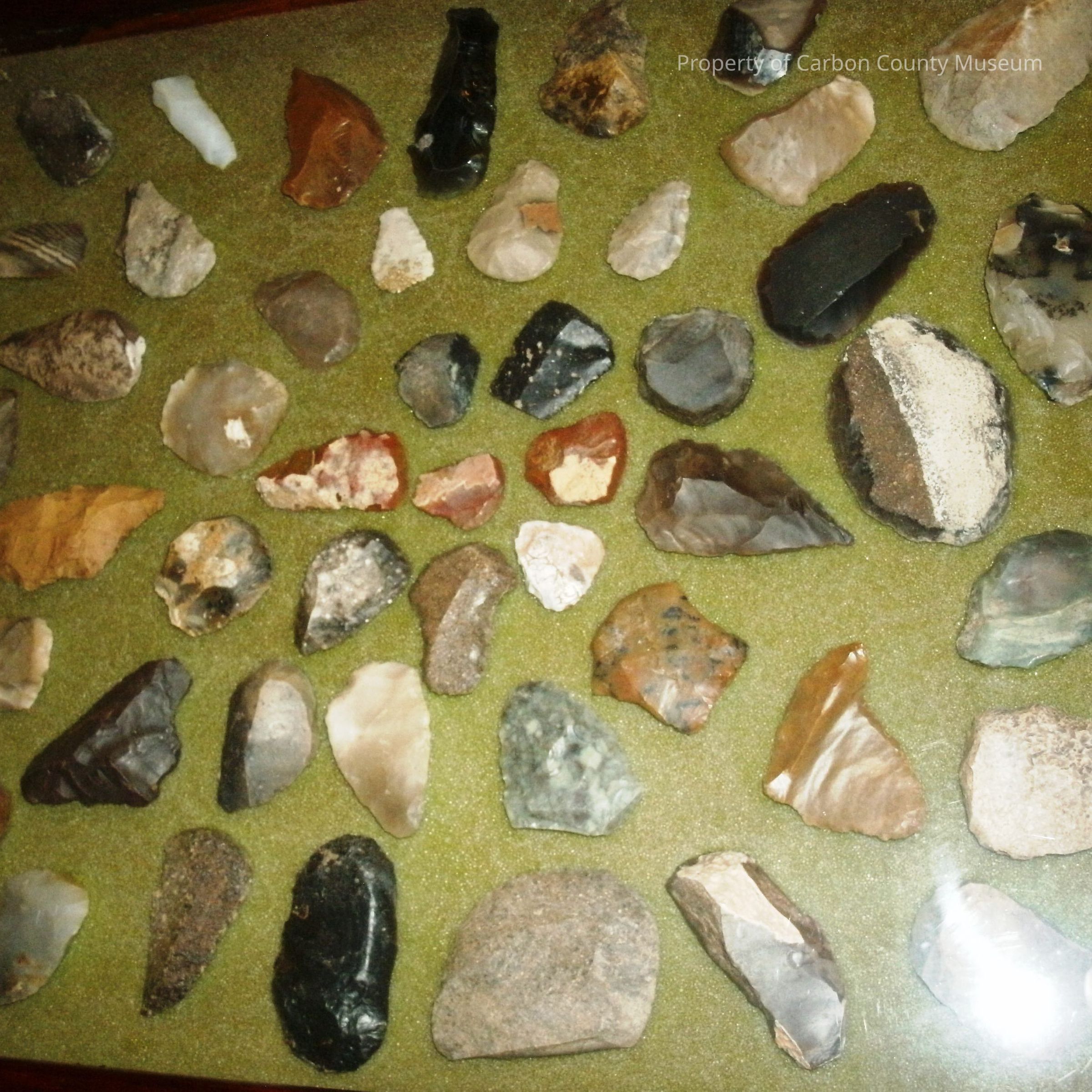 A 5/8" thick reddish brown wooden frame with a glass cover containing small to medium pieces of worked stone of various kinds and colors. They are arranged in 4 outgoing large circles with smaller chips of rocks at center. Faded olive green foam background. Written on back: Found by George Gates, Craig, CO, in Red Desert., WY and Moffat Co., CO, between 1961 &1978. Measures 13" x 14 7/8. " Good condition.Collection
