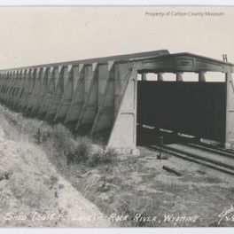 Update March 2011: Black & white print card. Image of the exterior of a long tunnel looking building. It is constructed of large, repeating, triangle side supports & wood sides. two sets of tracks are at the entrance. A fence is along the building on photo left. A water tower is in the distance. Embossed on the end of the building: "1917" Printed across the bottom in white: "U P Snow Shed (5618 Ft. Long) Rock River, Wyoming Sanborn Y807"
