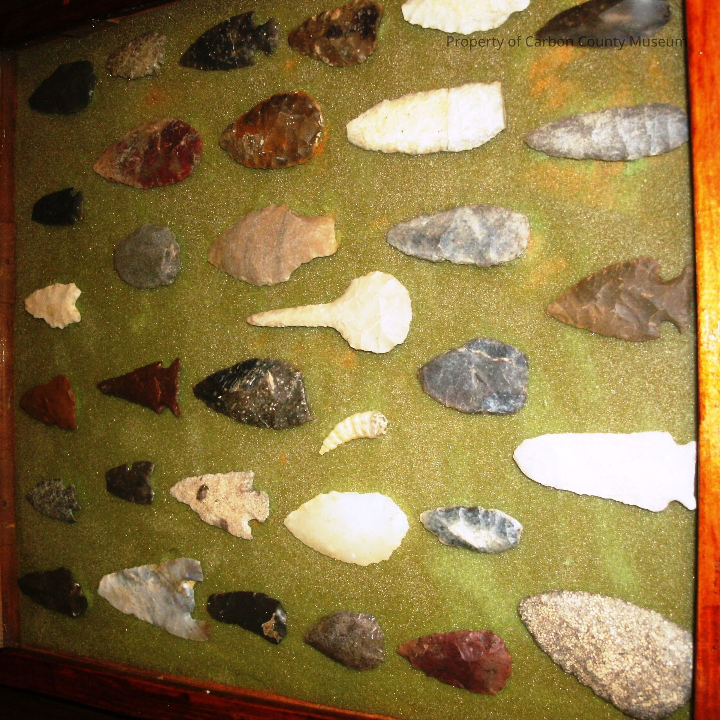 A 5/8" reddish brown wooden frame with a glass cover containing medium to large arrowheads of various kinds and colors. They are arranged primarily in six informal horizontal rows. There is a rattlesnake rattle in the third row. The focal point is a white drill point at center of third row. Faded olive green foam background. Written in black on back: Found by George Gates, Craig, CO, in Red Desert., WY & Moffat Co., CO. Measures 13 1/2" x 15." Good condition. Pressed wood back cover.Collection