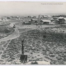 Update March 2011: Black & white print card. Image is an elevated view of a small town of scattered buildings, a dirt road & cables with cars hanging on them. Printed in white across bottom: "Tramway Encampment, Wyo." In lower right corner in white: "S Woody? x1197"