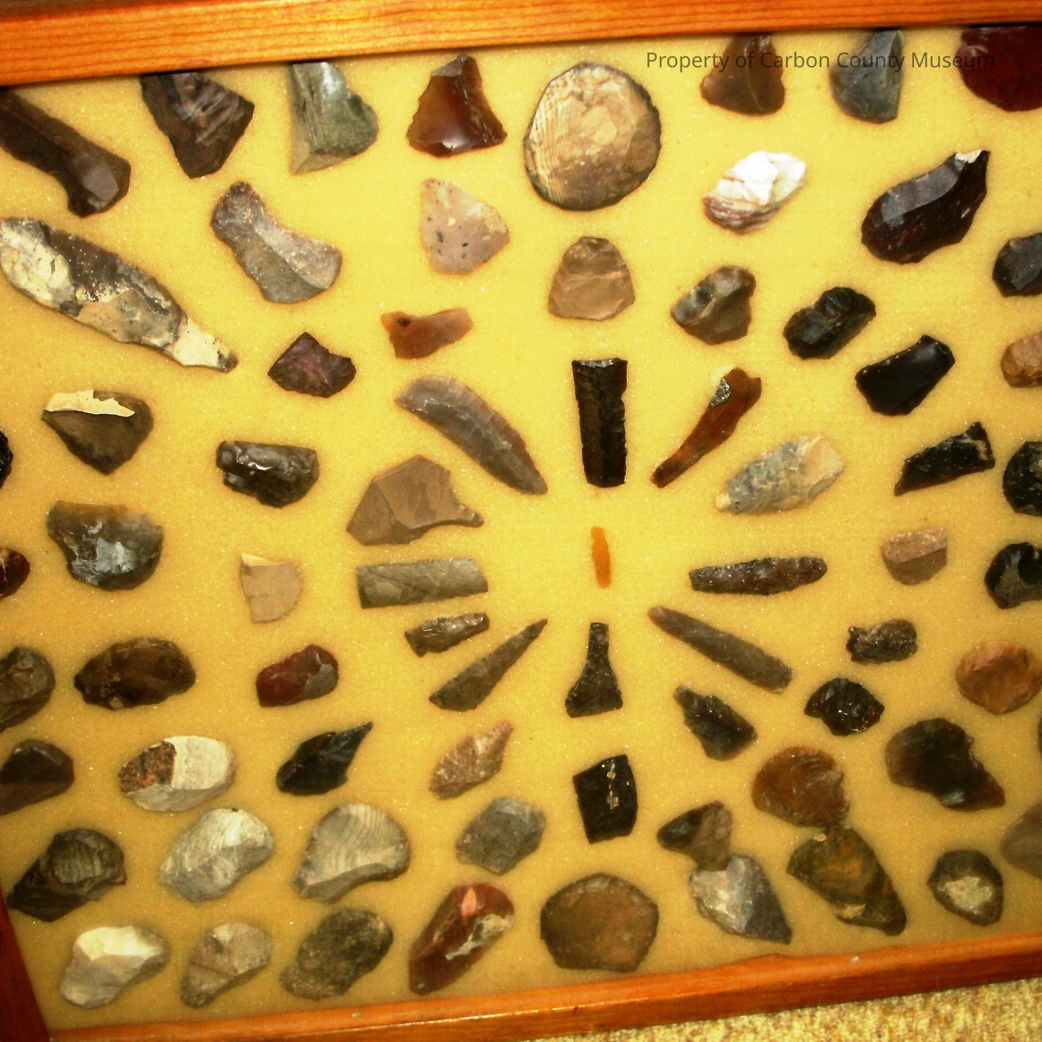 A 16" x 18 1/4" light wood frame with glass cover containing small scrapers and pieces arranged in 4 informal outgoing circles with smaller pieces in inner circles and larger pieces on outer circles. First inner circle, the points face inward with a single yellow tiny thin arrow as center focal point. Objects are mounted on yellow foam. Written on back of frame: Found by Mary Haughey in Sweetwater Co., WY and Moffat Co., CO 1955-1986. Good condition. Few scratches on frame.Collection