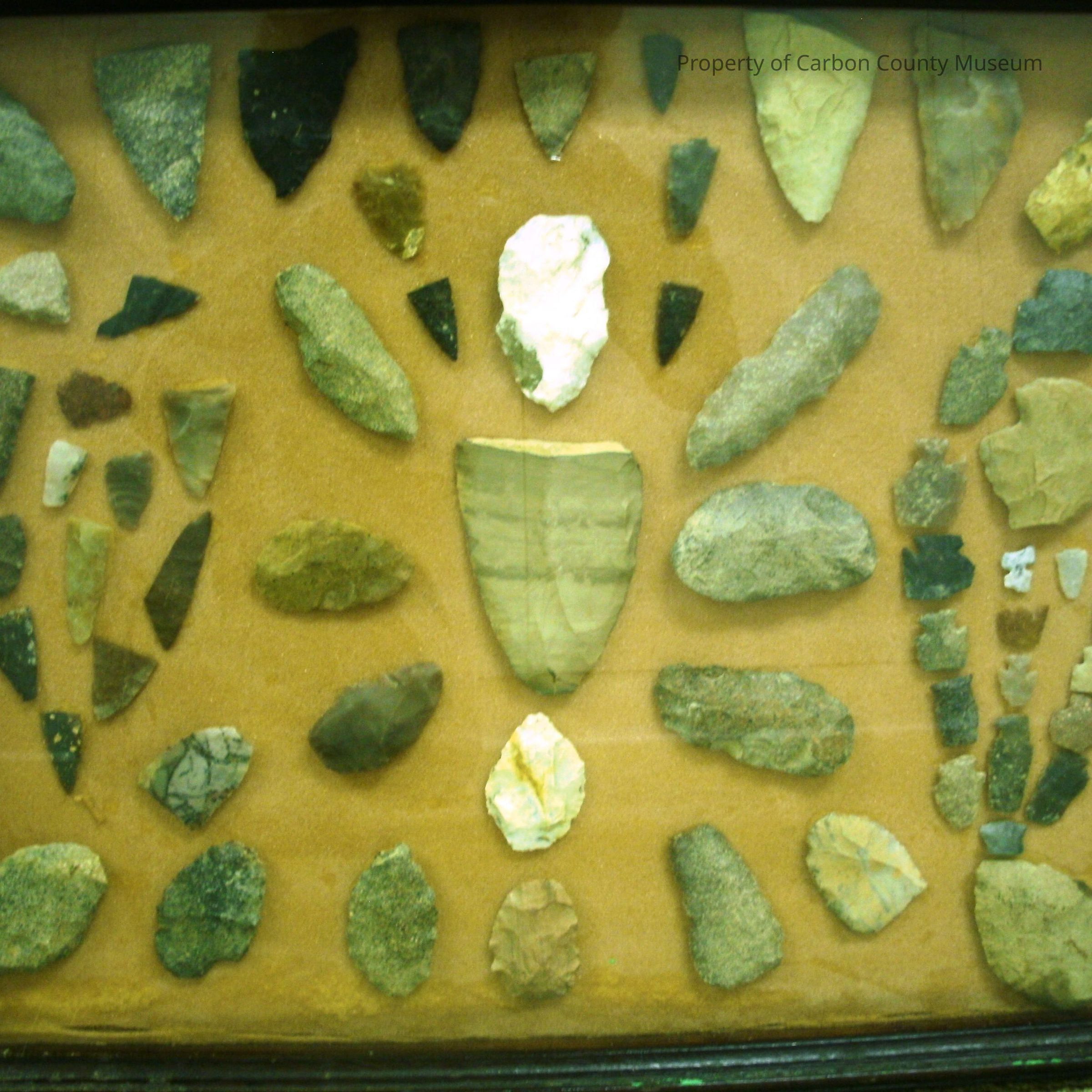 A 15 1/4" x 19 1/4" dark wood frame with glass cover containing large to small scrapers, arrowheads, worked pieces--most are missing points. They are mounted on tan/orange foam in horizontal rows at top and bottom edge with 3 vertical rows (informal) down the center with a large 1/2 piece pointed scraper at the center. There is an oval circle on each side featuring smaller pieces with other pieces inside the ovals. Written on back of frame: Found by George Gates, Craig, CO in Red Desert, WY and Moffat Co., CO 1961-1978. Good condition. Few scratches on frame. Backed with piece of paneling.Collection