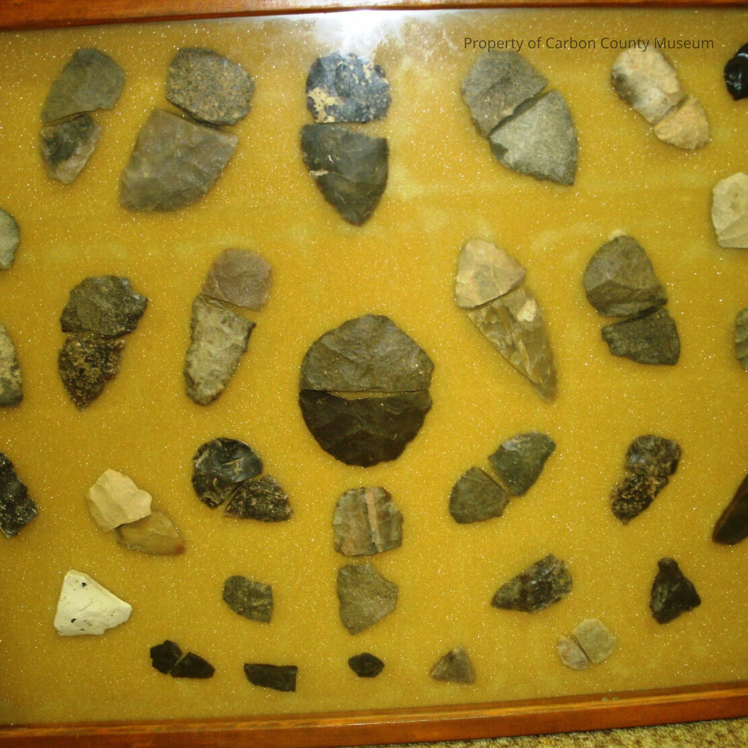 Light wood frame, 17" x 21," with glass top containing scrapers and other worked stone pieces mounted on gold/tan foam. Arranged in three informal circles with medium size broken (2 pieces) scraper at center as focal point. There are many broken pieces of scrapers put together to resemble a complete object. (They are not the same). Good condition. Some scratches, frame is backed with piece of paneling. Written on back: Found by Marion and Cleone Haughey 1983-84-85 in Red Desert area, WY.Collection