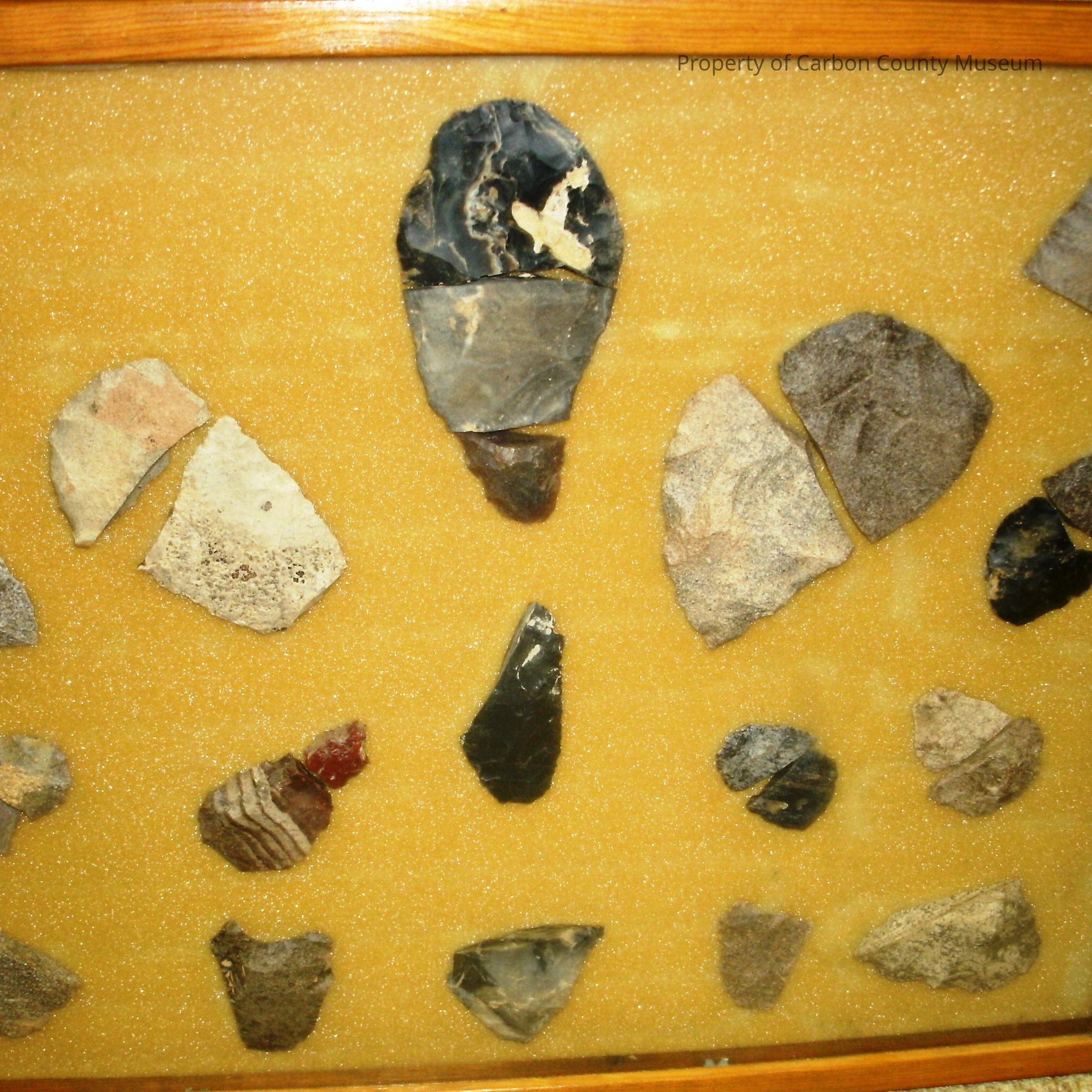 Light wood frame, 17" x 21," with glass top containing scrapers and other worked stone pieces mounted on gold/tan foam. Pieces are arranged in 2 irregular rows at lower edge and obliquely at top. Broken pieces are arranged to look like a single unit, but they are not the same. Good condition. Some scratches, some green foam residue on edges. Written on back: Found by Marion and Cleone Haughey 1983-84-85.Collection