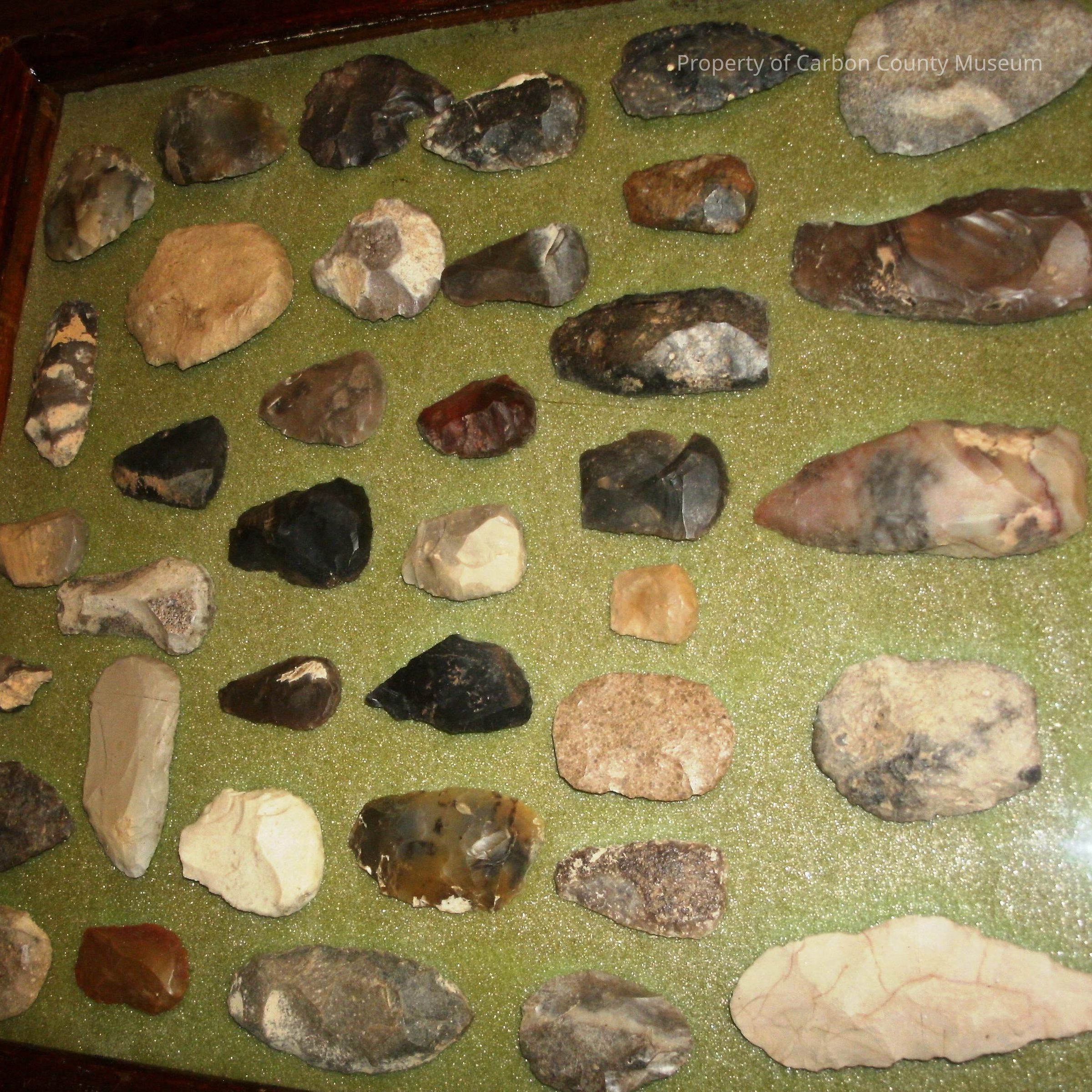 A 13 1/4" x 15" dark brown frame with glass cover. There are 6 rows of various scrapers and worked stone--small to medium size mounted on green foam. Multiple colors of stone, predominately gray-black. Good condition. Minor scratches on frame. Masonite frame backing which is screwed on. Written on back of frame in black: Found by George Gates, Craig, CO. 1961-1978. Red Desert, WY and Moffat County, CO.Collection