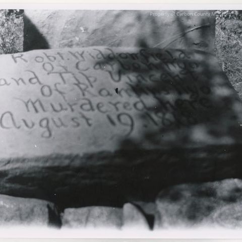 update 2/2008: Black and white print. Snapshot. Close-up of the carved stone on the rock cairn seen in 1960.367.0005. Carving reads: "Robt. Widdowfield of Carbon Wyo and Tip Vincent of Rawlins Wyo murdered here August 19, 1878."