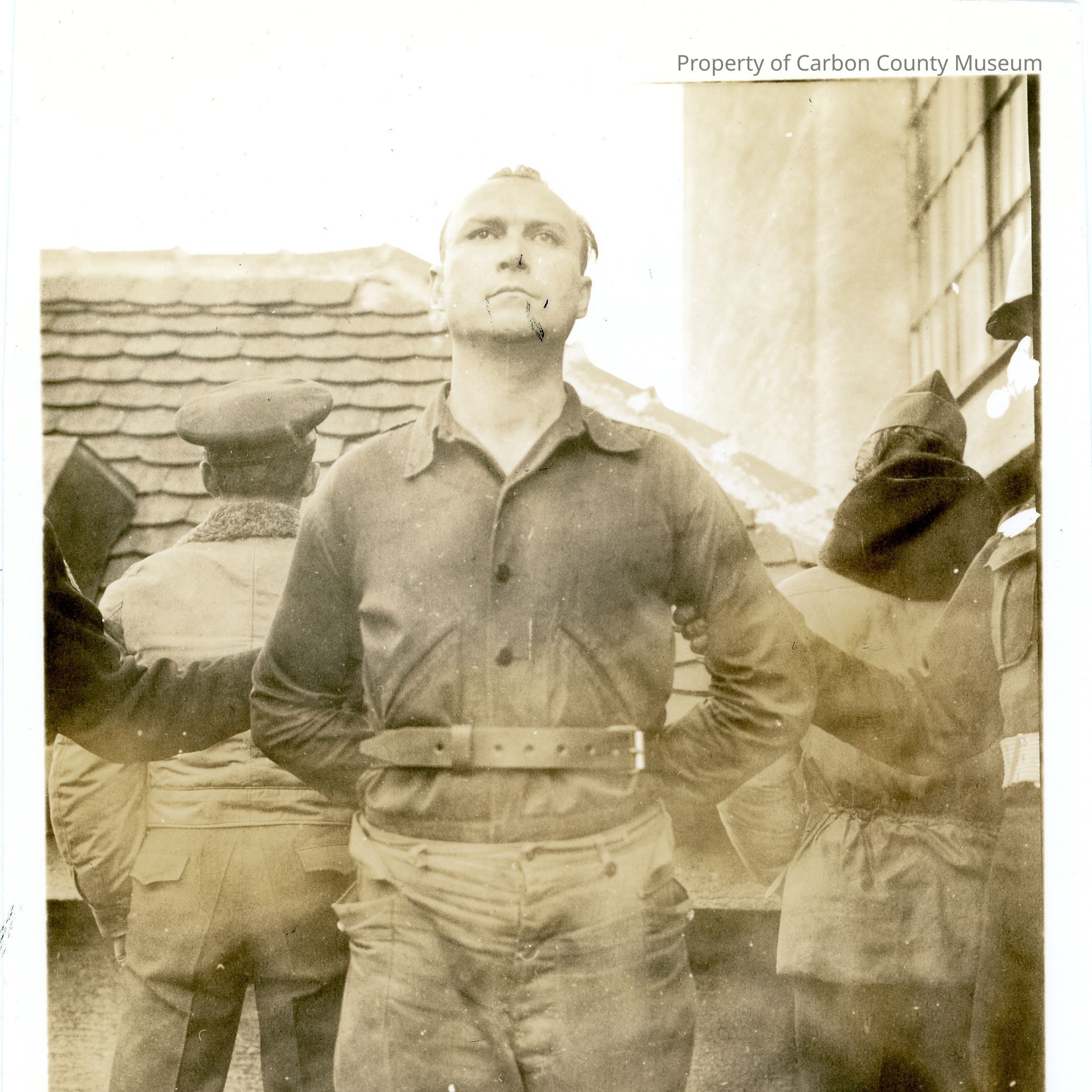 A sepia tone photograph of a man wearing a prisoner uniform, he is being held in place by two men out of frame. Behind the tree are two men in military uniforms with their backs to the camera. On the back of the photo is printing that reads "Kirchner, Kurt EXEC WCP, 12 NOV 48".