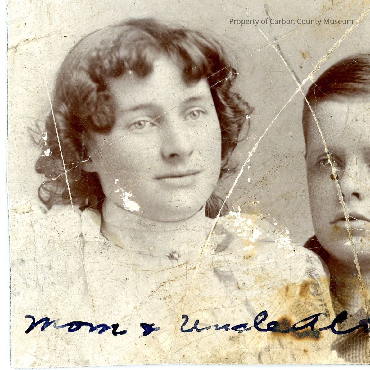 A small black and white photograph. Studio portrait of a young girl and boy sitting beside each other, headshots. Written along the bottom edge is "mom + uncle albert".