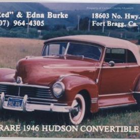 Color print. Snapshot. Image of a red vintage convertible automobile parked in a field. Red rag top; one door. California license plate "902XQ6". Printed on original negative:[upper left] "M. E. "Red" & Edna Burke (707) 964-4305" [upper right] "18603 No. Hwy. #1 #303 Fort Bragg, Ca. 95437" [lower edge] "Rare 1946 Hudson Convertible"