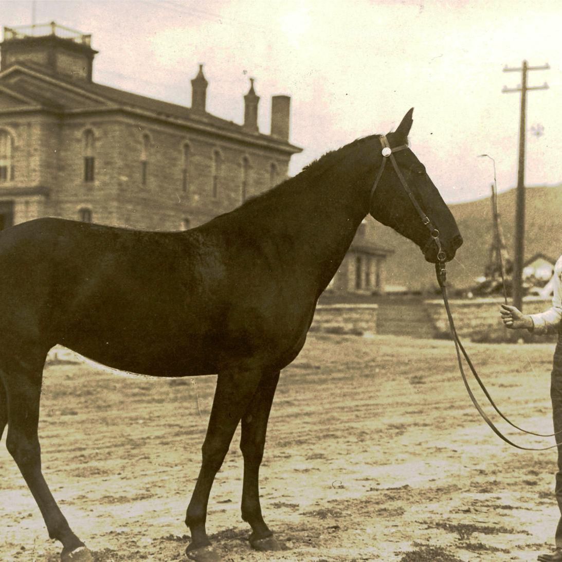 Black & white print snapshot. Image of a dark horse standing on a dirt street. Bridle held by a man in shirt sleeves at right; he also holding a small quirt; pair of gloves on ground at man's feet. Large, multi-story stone building with short squared tower with railing above door.