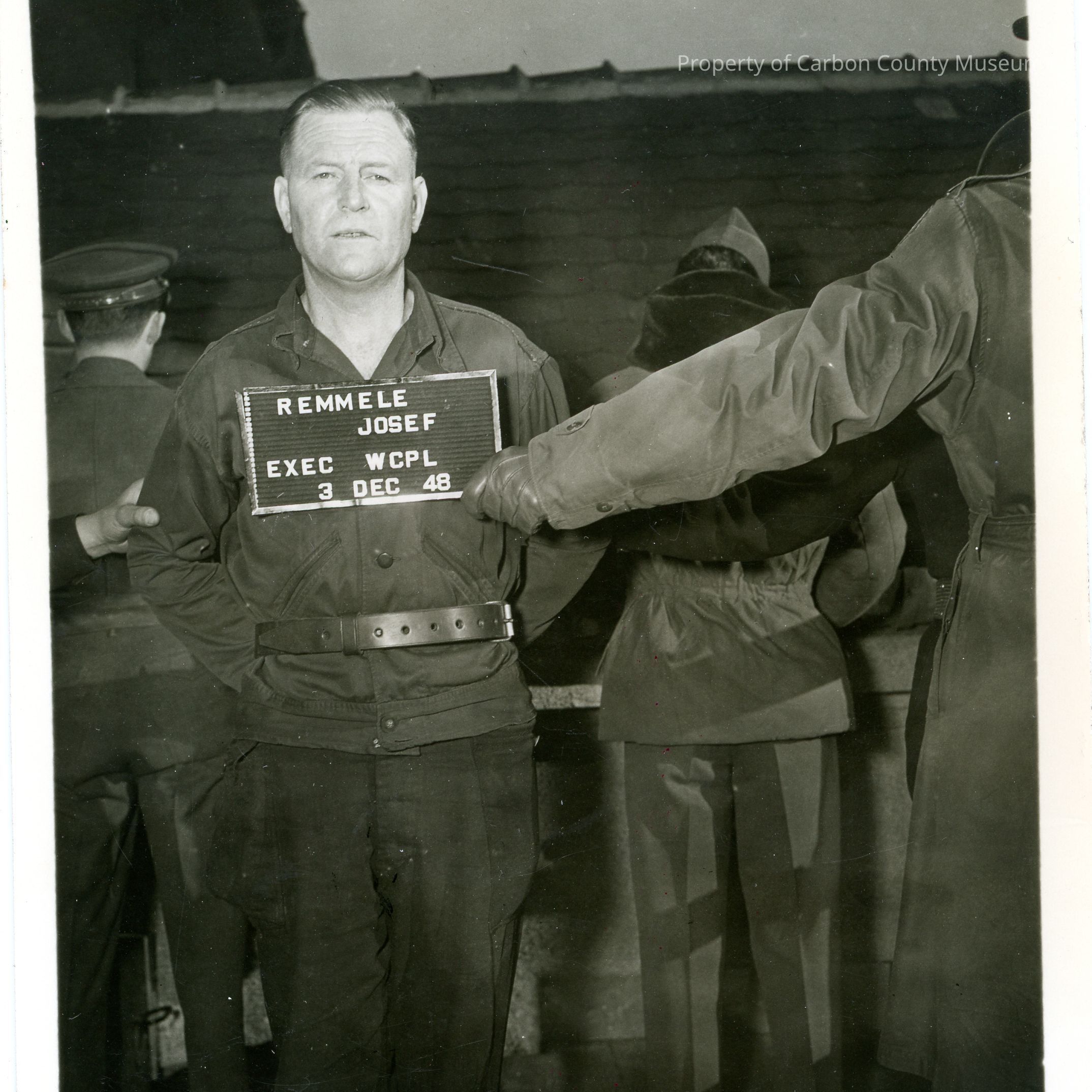 Black and white photograph. A man in a prisoner uniform is being held in place by two men out of frame. Behind the three are two men wearing military uniforms with their backs to the camera. A placard held in front of the prisoner reads "Remmele Josef EXEC WCPL 3 DEC 48".