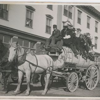Black & white print. Snapshot. Mounted on grey matboard. Image of a barrel-shaped wagon with a two horse (?) hitch. Two men on the seat; five people sitting on top of barrel. Multi-story building in background.