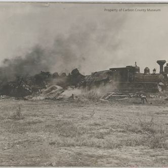 Black & white print. Snapshot. Mounted on grey matboard. Image of the aftermath of a train wreck. Steam engine upright on tracks in front of a line of smoldering debris. Second engine in debris behind tender of first. Workmen at front of wreckage & among debris at left. Scrubby ground in foreground. Front engine is #1279.