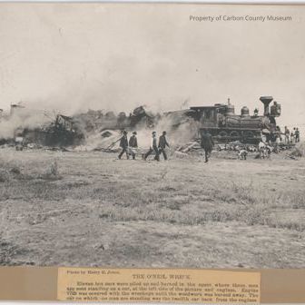 Written on back in pencil: "These pictures are of the O'neil train wreck in May, 1900 caused by an open switch & resulted in the death of 5 men, the destruction of two engines & the loss of eleven cars of merchandise". [on white adhesive label] "Train Wrecks"