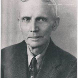 Black & white copy print. Studio pose. Head & shoulders portrait of a man with short greying hair. He is dressed in a heavy weave dark suit; dark patterned tie & light colored shirt.