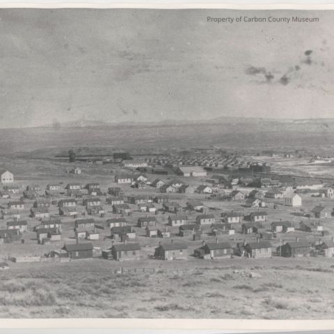 Update 2009: Black and white copy print of rows of houses. Approximately 50 houses in foreground. Several larger buildings beyond houses next to railroad. Beyond railroad more rows of houses. Rolling hills in background. Foreground, brush slope. Town of Hanna, Wy.