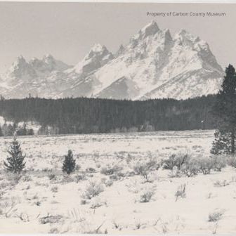 Black & white print. Snapshot. Image of the Grand Tetons with snow. Forrest in mid-ground. Snow-covered open space in foreground.