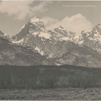 Black & white print. Snapshot. Image of the Grand Tetons with glacial snow on peaks. Forest in mid-ground; meadow in foreground.