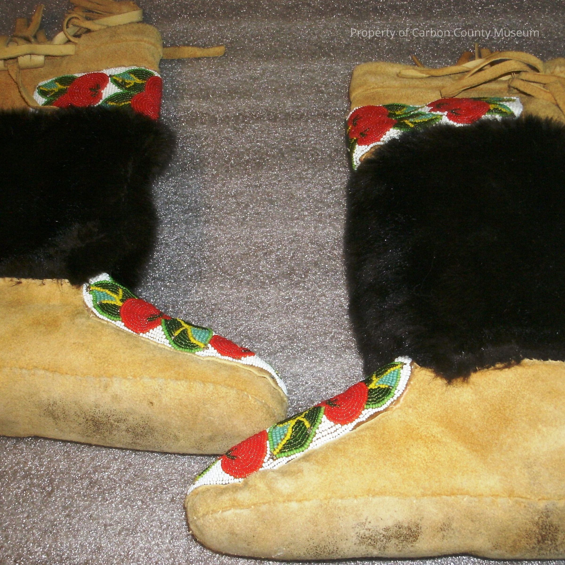 One pair of high top suede leather fringed moccasins beaded in cherry design on the forefoot and tops of each moccasin. The strip at top is 8 3/4" long and 2 1/2" wide. The shoe bottom is 10 1/4" long and side is 13 1/2" high, 7" mouton like strip inserted at middle of upper edges. Beadwork at forefoot is 6" x 3." There is fringe at top and leather ties at side. They have a denim lining. Bought from trader in Canada in 1970's. Good condition. Minor wear.Collection