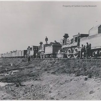 Black & white glossy print on cream mat of a train. There are three small engines with attached cargo boxes, on photo right, cargo box has loaded in it a wood box with peaked roof & a carved finial on end of peak. The number "66" is painted on sides & end of the train box. In the center cargo box is debris that looks like brush piled high in disarray. In photo center another cargo box has timbers stacked high. Four men are beside or on first engine, next one a man stands on top of the engine & one is standing on the engine side near the front. Another man stands on the ground a few feet from the tracks. The three engines are headed toward photo left & in front of them is a long line of box cars with cargo on top. A wagon is on top of one of them. The box cars continue in distance toward photo left. The tracks are built above the surrounding ground, which is dirt & rocks with a small amount of snow.