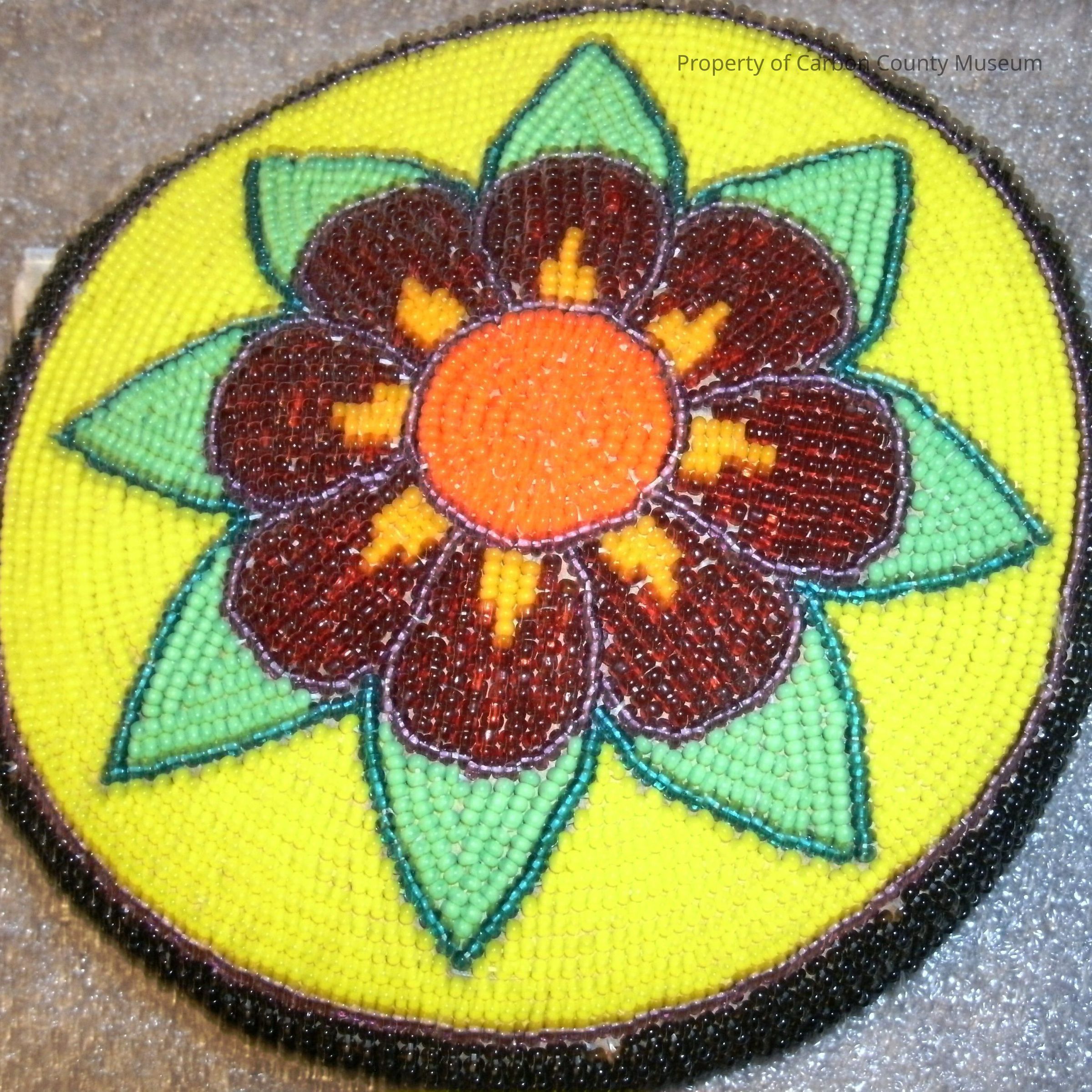 A two sided round, zippered bag with a beaded floral (red/orange/ green beads) design on yellow beaded background on both sides of purse. There are black beaded edges with white leather edge connecting the two sides. Purse is 5 3/8" in diameter. Bought in Blackfoot, ID in the 1970's. Good condition.Collection