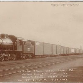 Sepia print on grey mat of a steam engine "1741" pulling a long line of box cars. Two men stand beside near the cow catcher on the engine. Another man is in the engineer's compartment. On side of engine is: "Union Pacific" & in several locations on the cars. On photo right are three children, one is leaning against a pole. Printed in white on negative: "Special Train, Wool 600,000 lbs,, Cosgriff Bros., Fort Steele, Wyo. to Brown & Adams Boston, Mass., Via U.P., C & NW & Blue Line" Engraved in lower right corner: "W G Walker Cheyenne, Wyo.