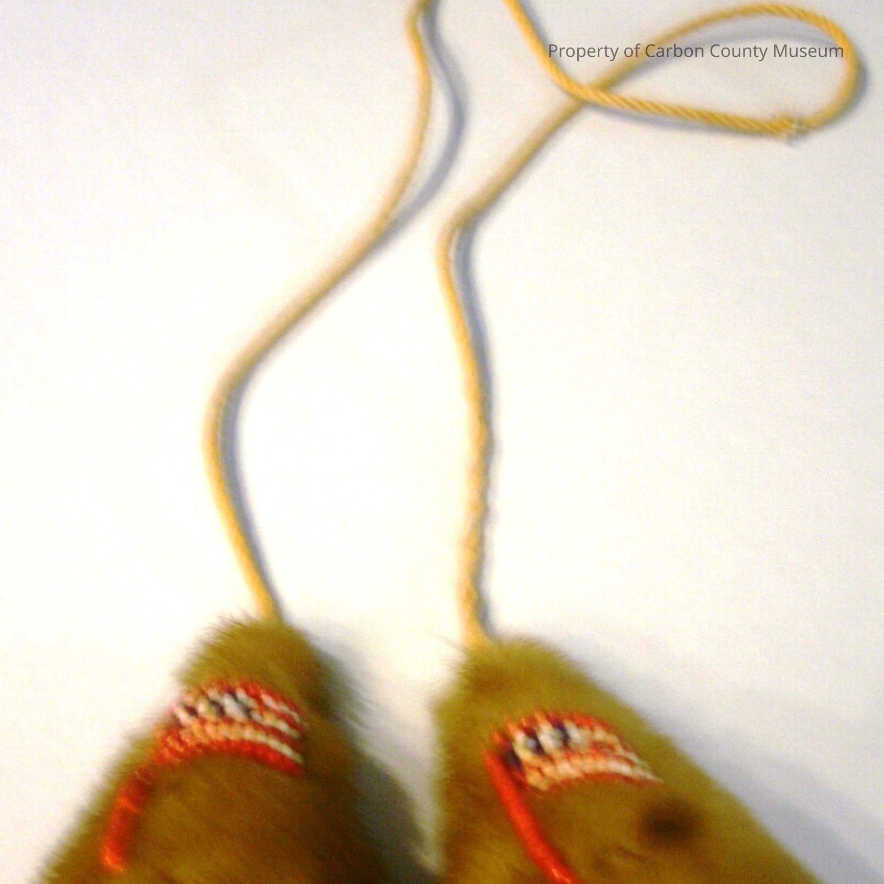 Inuit sealskin clackers handsewn with brown thread. Measure 3 1/2" x 1 1/2." A tiny beaded American flag is on each one. They are held together by light gold cord with fur on the tied end. Cords are 26" long to clackers. Good condition though worn and soiled. Donor purchased in Palmer, Alaska.Collection