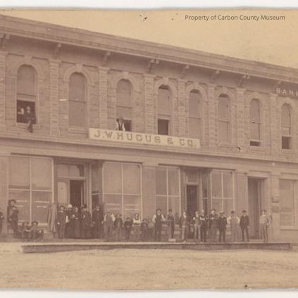 Update - 2009: Sepia tone print on matboard. J. W. Hugus building on 400 block of Front Street. building is multi-level with 9 arch windows on 2nd floor. Lower level has large window & 3 entrances. Sign on upper level: "Bank". Sign above 1st level: "J.W. Hugus &Co." A line of about 30 people are on store board walk posing for photo. In an upper window on photo left two people can be seen, one sitting with his feet out of window.