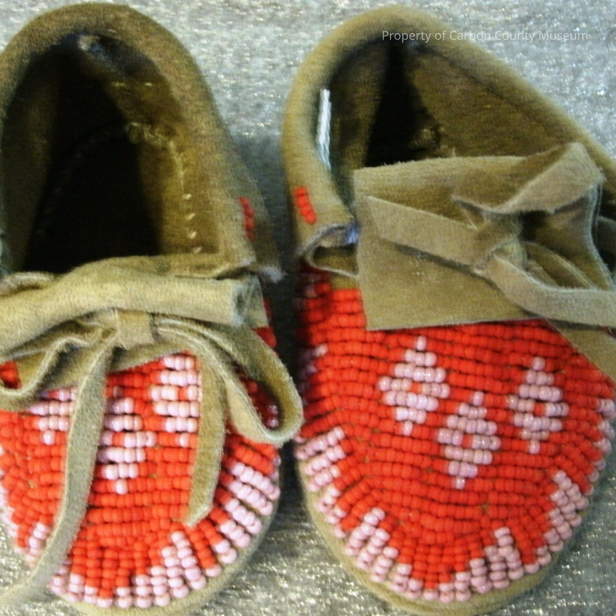 One pair of red and pink beaded baby moccasins (tiny geometric design). Beading is on forefoot, sides, and few red beads on each side on the ankle edge. Moccasins measure 4 1/4" long x 2 1/2" wide. Note: label stuck on left shoe sole has "Sioux" written on it in black ink. Donor purchased the item in Oregon. She believed them to be made on the Warm Springs Reservation. Good condition. Some wear. There is a tiny pinhole on sole of left moccasin.Collection