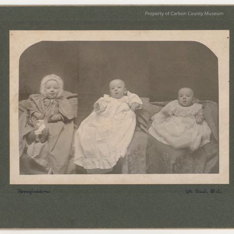 Update 2008: Black and white print. Studio portrait. Three images in one print. Mounted on green matboard. Three images of an infant. Left to right: 1. Infant, seated on a cloth draped chair dressed in a furry bonnet and long cape, shouldered coat, white dress with lace trim and shoes. 2. Infant seated on the same chair, dressed in long white christening dress. 3. Infant seated on same chair dressed in long white dress with wide lacy collar.