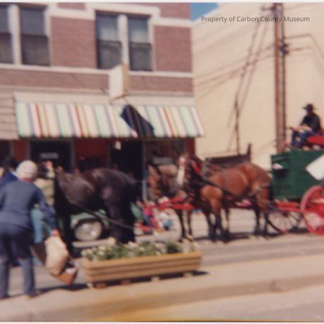 Color photograph of 4 horses harnessed to a green wagon with red wheels and tongue. There is a large brick building with a striped awning in the background. The picture is blurry/out of focus.