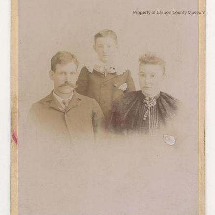 Update 2008: Sepia print. Cabinet Card. Studio portrait. Head and shoulders image of a man, woman and child. Man is dressed in a suit buttoned at top button, white shirt and patterned tie, shield shaped pin on his right lapel, he has short hair and a long mustache. Woman is wearing a dark patterned dress with plain tucked bodice front, long sleeves, and flowing cape like shoulder covers; there is a flower shaped bow at neck front and a chain and pendant jewelry piece attached to bow and left side of bodice, her hair is pulled back and pinned up. Man and woman appear to be seated . Child, young boy, is standing behind and between the adults; he is dressed in a double-breasted suit, white shirt with wide lace collar and light scarf tied at neck; a lace (?) hankerchief is in the left breast pocket.