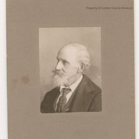 Update 2008: Sepia print. Studio portrait. Mounted on grey patterned matboard. Head and shoulders nearly profile, portrait of an older man dressed in a dark suit with checked vest, white shirt an dark patterned tie. He has grey thinning hair and sports a bushy chin beard and mustache. Painted backdrop in background. Three links of a watch chain or pin visible on left side of vest front.