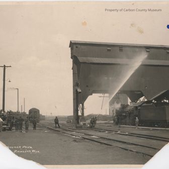 Black & white print on of an overhead loading coal bin over the railroad tracks. An engine "2493" with car, sits below the chutes. Four men on tracks are holding a large fire hose shooting water into the air toward the bin. More men stand next to a fire truck to photo left of tracks. More railroad buildings & a large water tower are on photo right in distance. Writing on the roof of a building in the distance: "The Continental Supply Co., Oil Gas Well Supplies." More tracks are on photo left with cars on them. Photo taken from Rawlins yard looking east near present day Colorado St.