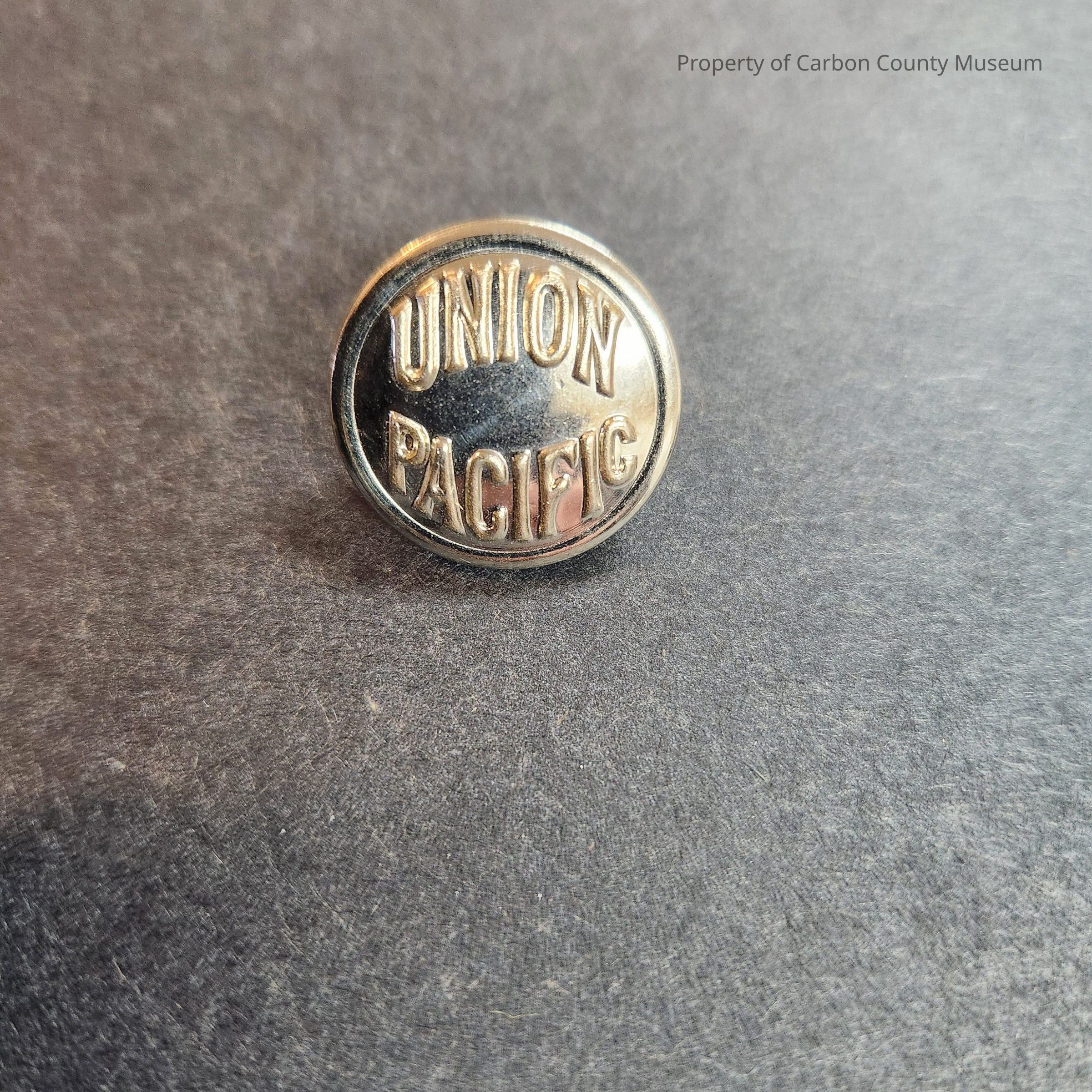 A metal button, likely tin, with the words "UNION PACIFIC" embossed on the face, on the reverse the words "SUPERIOR QUALITY" are etched into.