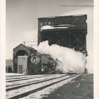 Black & white print of an overhead coal bin with a train coming from beneath with steam billowing from it's top. "Engine X819" On top photo left is a small brick structure & a tall wood structure. Tracks are in the foreground with a small amount of snow.