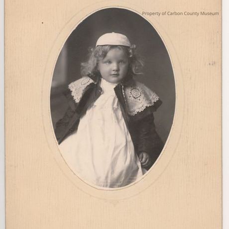 Update 2008: Black and white print. Studio portrait. Oval. Mounted on tan patterned matboard with recessed oval "frame" around image . Image of a young girl wearing a white lace trimmed dress and dark coat with wide cape like collar, covered with white lace. She is wearing a white cap on her head, her hair is loose.