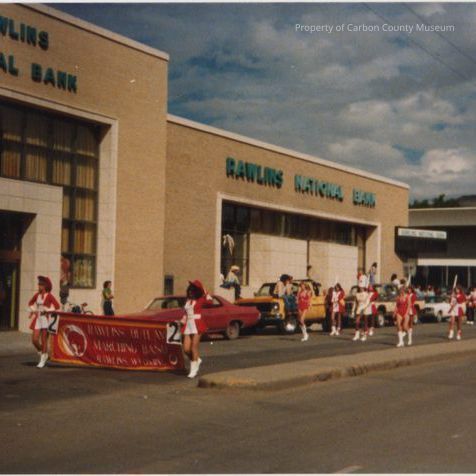 Color photograph of a marching band led by 2 young women wearing red and white dresses and carrying a red and yellow banner "Rawlins Outlaw Marching Band, Rawlins, Wyoming". There are 2 large buildings in the background with lots of glass windows and the signs "Rawlins National Bank". The picture is taken from across the street.