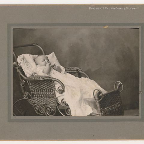 Update 2008: Black and white print. Studio portrait. Mounted on grey with indented darker grey "frame" around image. Image of an infant resting on pillow with lace-edge white pillowcase in a wicker pram. Infant dressed in long white christening gown. Painted backdrop behind.