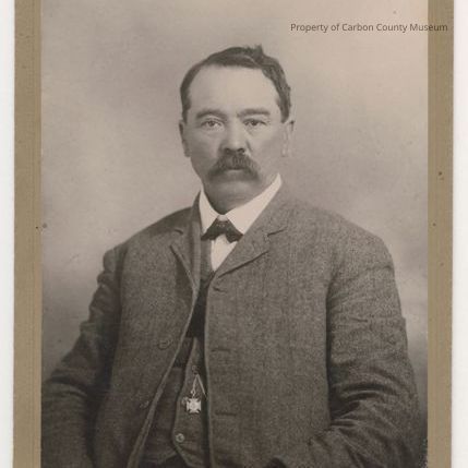 Update 2008: Black and white print. Studio portrait Mounted on green brown patterned matboard. Half-length portrait of a seated man dressed in tweed three piece suit, white shirt and dark bow tie. He has short hair and a mustache. A masonic watch fob hangs from button on vest.