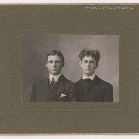 Update 2008: Black and white print. Studio portrait mounted on olive green matboard with gold edges. Raised frame around image. Head and shoulders image of two young men. Man on left is dressed in a dark suit with vest, white shirt, and dark tie, white handkerchief in left breast pocket. Short hair with side part. Man on right is dressed in a dark suit with vest, white shirt, and cravat Short very wavy hair with center part. Painted backdrop behind.