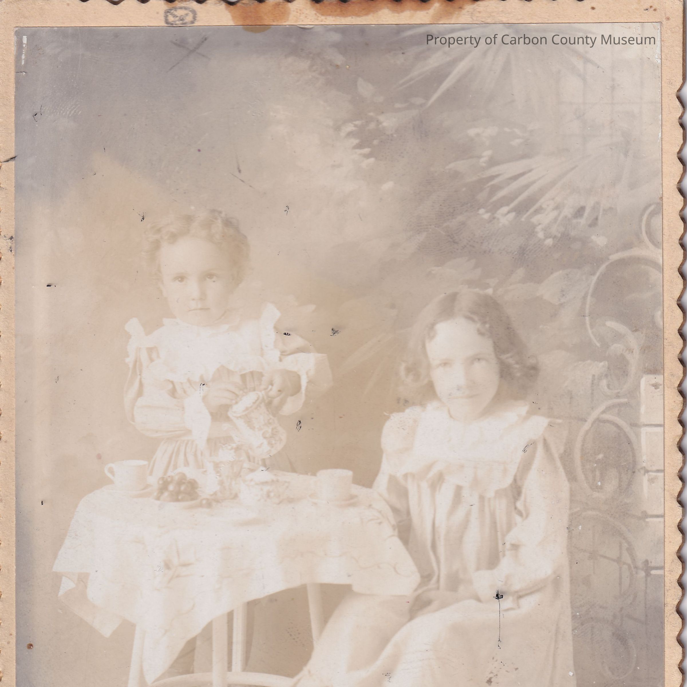 Cabinet card photograph of two young girls seated at a table. Edges of card are cut to a pattern. Writing on the card reads "Thayer" and "Rock Springs Wyo." Writing on the reverse has been crossed out.Collection