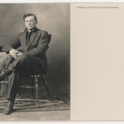 Update 2008: Black and white print. Studio portrait. Printed on postcard paper. Full length portrait of a man seated in a turned wood chair with his right arm resting on a turned wood table with fringed throw and cap on top. Man has his hands clasped in his lap and his left leg crossed over and resting on his right knee. he is wearing a dark suit, dark shirt, dark tie, dark socks and high top button shoes. Painted backdrop behind and patterned rug on floor.