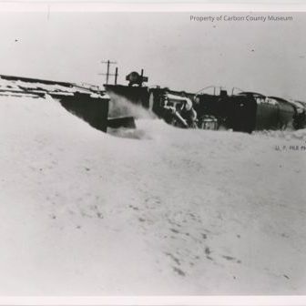 Black & white print of a train stuck in the snow. Large snow drifts to top of the car on photo left. Printed on right side in black: "U.P. File Photo: