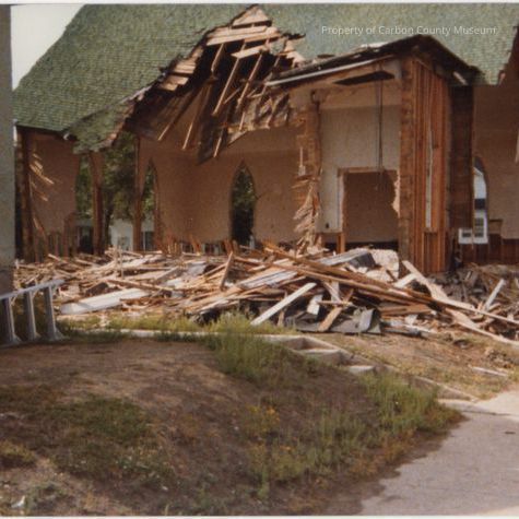 Written on the back: "Old Methodist church being destroyed, 1979" (blue ink), "5" (black ink)Collection