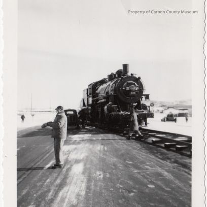 B/W photograph of a train engine with a car next to it. There is a man wearing a coat in the foreground and another person in front of the engine. There appears to be snow on the ground in the background. The edges of the photo are scalloped.